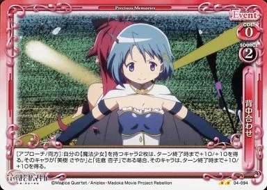 Nombre comercial en japonés: プレシャスメモリーズ/UC/イベント/赤/ブースターパック 劇場版魔法少女まどか☆マギカ[新編]叛逆の物語 04-094[UC]:背中合わせ