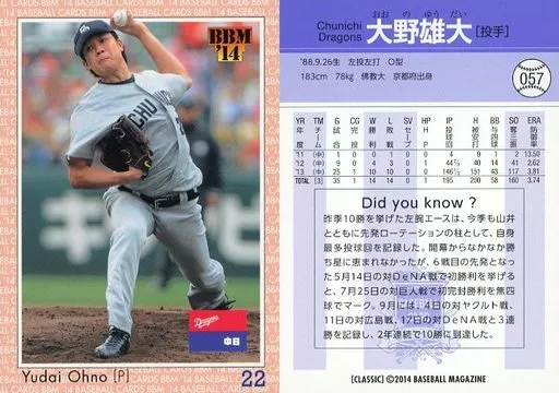 Nombre comercial en japonés: BBM/レギュラーカード/現役レギュラー/中日ドラゴンズ/BBM2014 ベースボールカードクラシック 057 [レギュラーカード] : 大野雄大