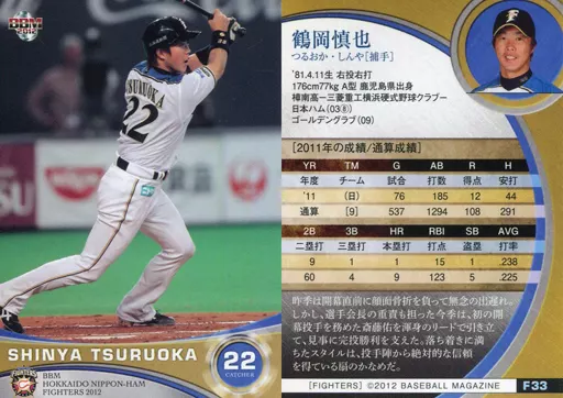 Nombre comercial en japonés: BBM/レギュラーカード/BBM2012 北海道日本ハムファイターズ F33 [レギュラーカード] : 鶴岡慎也
