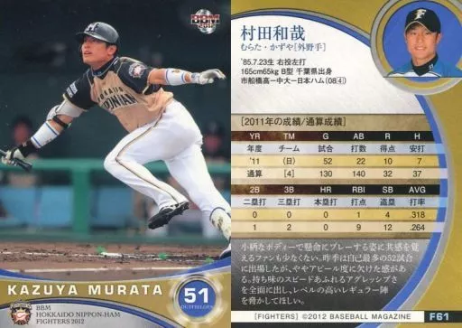 Nombre comercial en japonés: BBM/レギュラーカード/BBM2012 北海道日本ハムファイターズ F61 [レギュラーカード] : 村田和哉