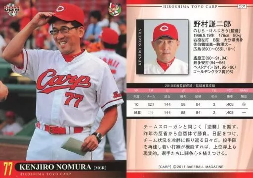 Nombre comercial en japonés: BBM/レギュラーカード/BBM2011 広島東洋カープ C01 [レギュラーカード] : 野村謙二郎