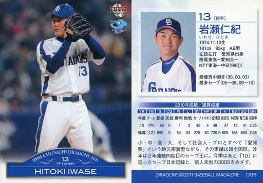 Nombre comercial en japonés: BBM/レギュラーカード/BBM2011 中日ドラゴンズ D05 [レギュラーカード] : 岩瀬仁紀