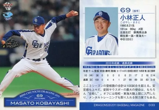 Nombre comercial en japonés: BBM/レギュラーカード/BBM2011 中日ドラゴンズ D33 [レギュラーカード] : 小林正人