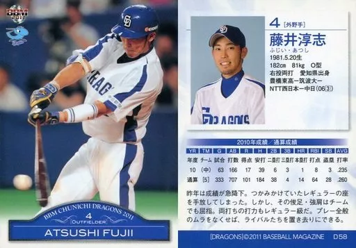 Nombre comercial en japonés: BBM/レギュラーカード/BBM2011 中日ドラゴンズ D58 [レギュラーカード] : 藤井淳志