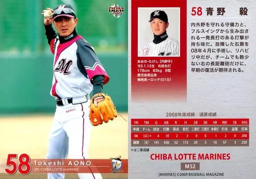 Nombre comercial en japonés: BBM/レギュラーカード/BBM2009 千葉ロッテマリーンズ M52 [レギュラーカード] : 青野毅