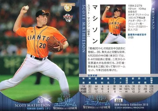 Nombre comercial en japonés: BBM/レギュラーカード/読売ジャイアンツ/BBM2015 ヒストリックコレクション 思い出のユニフォーム 008 [レギュラーカード] : マシソン