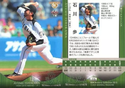 Nombre comercial en japonés: BBM/レギュラーカード/千葉ロッテマリーンズ/BBM2015 ヒストリックコレクション 思い出のユニフォーム 115 [レギュラーカード] : 石川歩