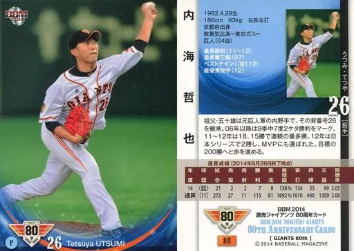 Nombre comercial en japonés: BBM/レギュラーカード/現役選手/読売ジャイアンツ/BBM2014 読売ジャイアンツ 80週年カード 80 [レギュラーカード] : 内海哲也