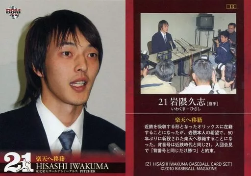 Nombre comercial en japonés: BBM/レギュラーカード/-/東北楽天ゴールデンイーグルス/BBM2010 岩隈久志カードセット「21」 13 [レギュラーカード] : 楽天へ移籍