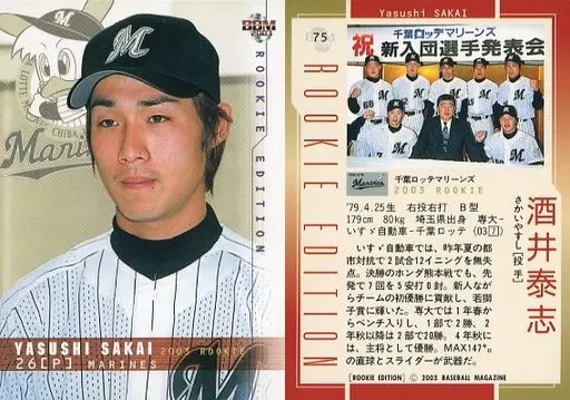 Nombre comercial en japonés: BBM/レギュラーカード/千葉ロッテマリーンズ/BBM2003 ルーキーエディション 075 [レギュラーカード] : 酒井泰志