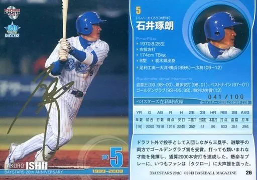 Nombre comercial en japonés: BBM/レギュラーカード/BBM2013 ベイスターズ20周年記念カード 26[レギュラーカード]:石井琢朗(金箔サイン入り)(/100)