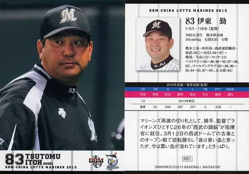 Nombre comercial en japonés: BBM/レギュラーカード/BBM2013 千葉ロッテマリーンズ M01 [レギュラーカード] : 伊東勤