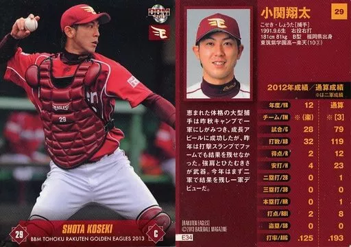 Nombre comercial en japonés: BBM/レギュラーカード/BBM2013 東北楽天ゴールデンイーグルス E34 [レギュラーカード] : 小関翔太