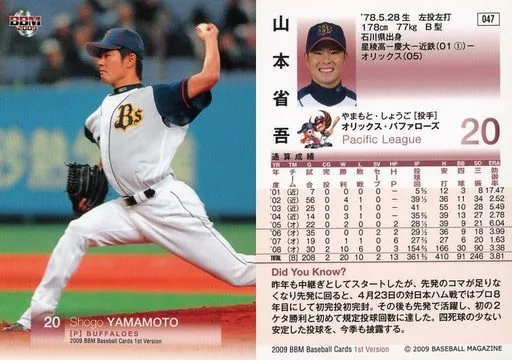 Nombre comercial en japonés: BBM/レギュラーカード/オリックス・バファローズ/BBM2009 ベースボールカード 1stバージョン 047 [レギュラーカード] : 山本省吾