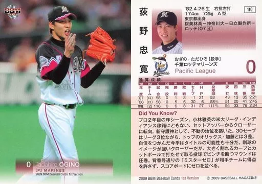 Nombre comercial en japonés: BBM/レギュラーカード/千葉ロッテマリーンズ/BBM2009 ベースボールカード 1stバージョン 110 [レギュラーカード] : 荻野忠寛