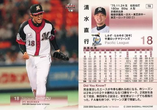 Nombre comercial en japonés: BBM/レギュラーカード/千葉ロッテマリーンズ/BBM2009 ベースボールカード 1stバージョン 116 [レギュラーカード] : 清水直行