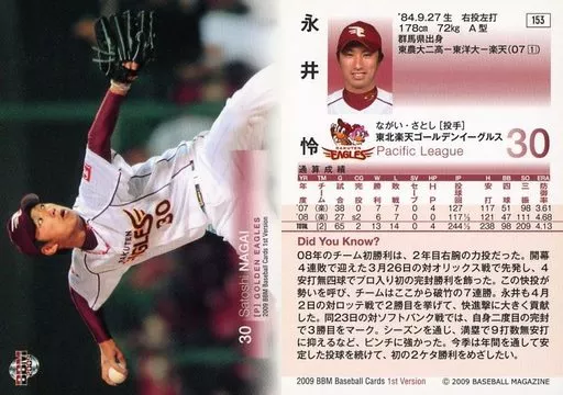 Nombre comercial en japonés: BBM/レギュラーカード/東北楽天ゴールデンイーグルス/BBM2009 ベースボールカード 1stバージョン 153 [レギュラーカード] : 永井怜