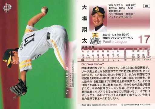 Nombre comercial en japonés: BBM/レギュラーカード/福岡ソフトバンクホークス/BBM2009 ベースボールカード 1stバージョン 186 [レギュラーカード] : 大場翔太