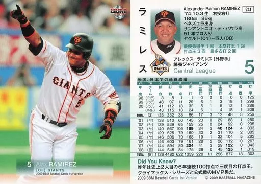 Nombre comercial en japonés: BBM/レギュラーカード/読売ジャイアンツ/BBM2009 ベースボールカード 1stバージョン 241 [レギュラーカード] : ラミレス