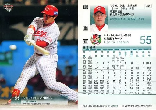 Nombre comercial en japonés: BBM/レギュラーカード/広島東洋カープ/BBM2009 ベースボールカード 1stバージョン 356 [レギュラーカード] : 嶋重宣
