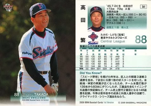 Nombre comercial en japonés: BBM/レギュラーカード/東京ヤクルトスワローズ/BBM2009 ベースボールカード 1stバージョン 361 [レギュラーカード] : 高田繁