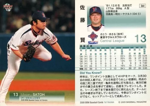 Nombre comercial en japonés: BBM/レギュラーカード/東京ヤクルトスワローズ/BBM2009 ベースボールカード 1stバージョン 364 [レギュラーカード] : 佐藤賢
