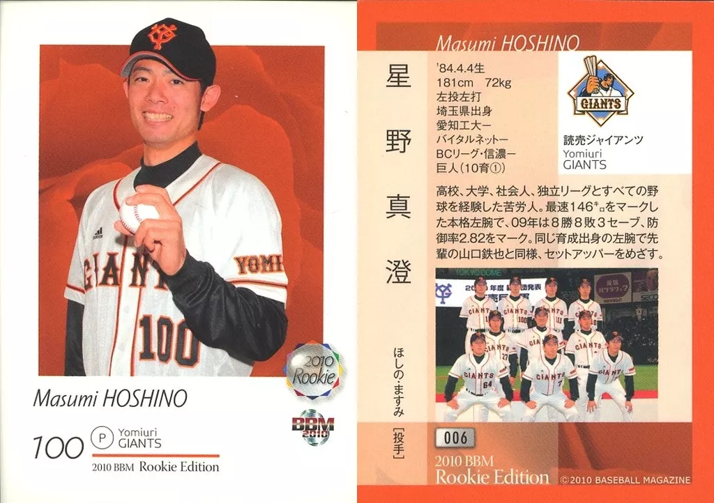 Nombre comercial en japonés: BBM/レギュラーカード/ルーキー/読売ジャイアンツ/BBM2010 ベースボールカード ルーキーエディション 006 [レギュラーカード] : 星野真澄