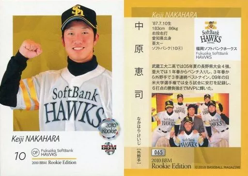 Nombre comercial en japonés: BBM/レギュラーカード/ルーキー/福岡ソフトバンクホークス/BBM2010 ベースボールカード ルーキーエディション 065 [レギュラーカード] : 中原恵司