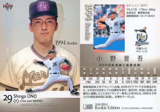 Nombre comercial en japonés: BBM/レギュラーカード/現役/千葉ロッテマリーンズ/BBM2010 ベースボールカード ルーキーエディション 102 [レギュラーカード] : 小野晋吾