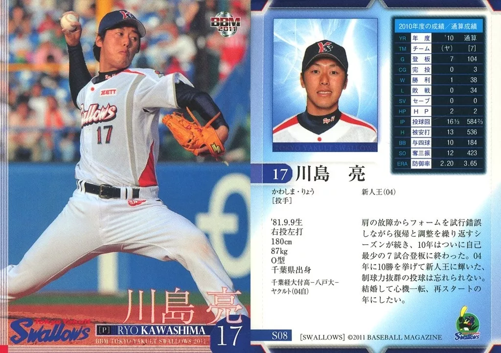Nombre comercial en japonés: BBM/レギュラー/BBM2011 東京ヤクルトスワローズ S08[レギュラー]:川島亮