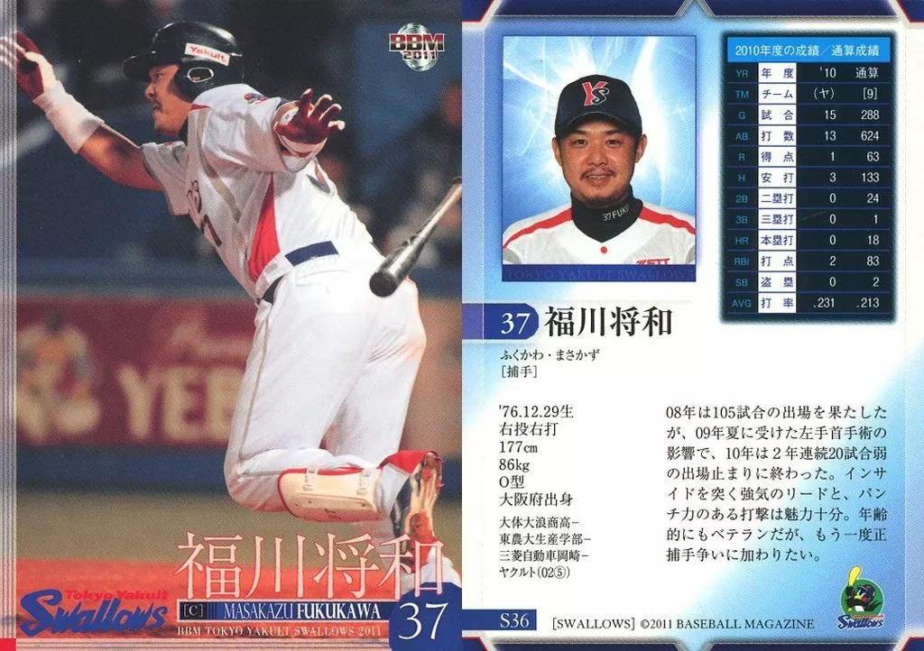 Nombre comercial en japonés: BBM/レギュラー/BBM2011 東京ヤクルトスワローズ S36[レギュラー]:福川将和