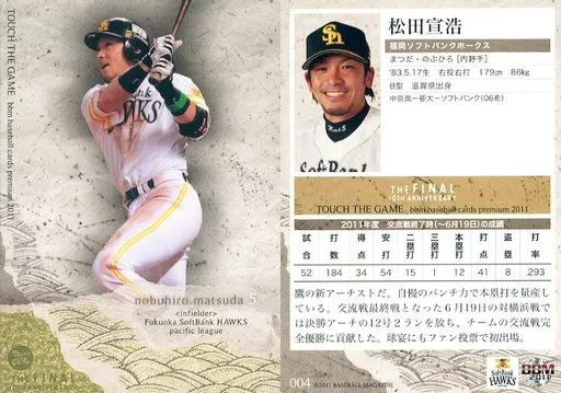 Nombre comercial en japonés: BBM/レギュラー/福岡ソフトバンクホークス/BBM2011 タッチ・ザ・ゲームTHE FINAL-10th Anniversary- 004[レギュラー]:松田宣浩