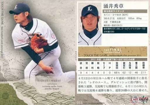 Nombre comercial en japonés: BBM/レギュラー/埼玉西武ライオンズ/BBM2011 タッチ・ザ・ゲームTHE FINAL-10th Anniversary- 011[レギュラー]:涌井秀章