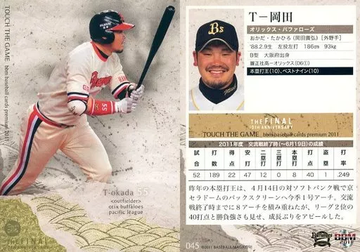 Nombre comercial en japonés: BBM/レギュラー/オリックス・バファローズ/BBM2011 タッチ・ザ・ゲームTHE FINAL-10th Anniversary- 045[レギュラー]:T-岡田