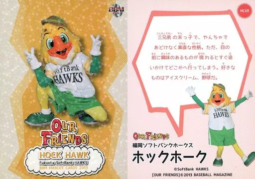 Nombre comercial en japonés: BBM/レギュラー/福岡ソフトバンクホークス/BBM2013 マスコットカード OUR FRIENDS MC68[レギュラー]:ホックホーク(キラパラレル版)