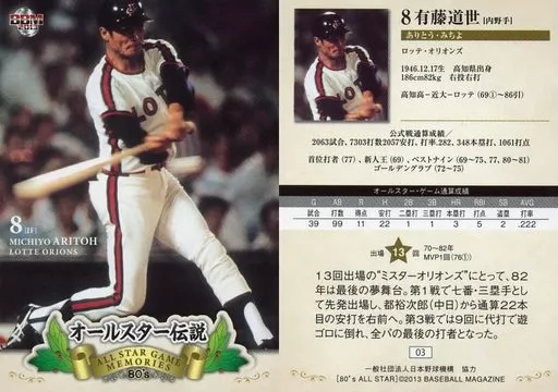 Nombre comercial en japonés: BBM/レギュラー/BBM2013 オールスター伝説 3[レギュラー]:有藤道世