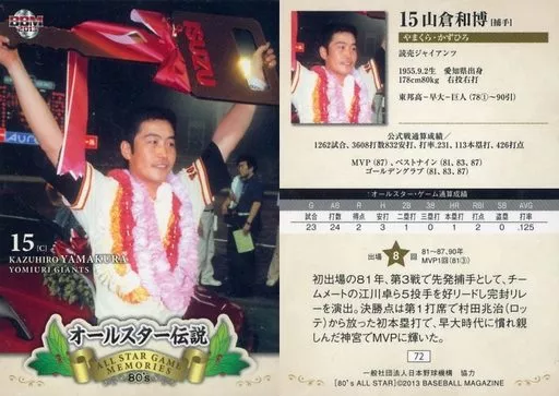 Nombre comercial en japonés: BBM/レギュラー/BBM2013 オールスター伝説 72[レギュラー]:山倉和博