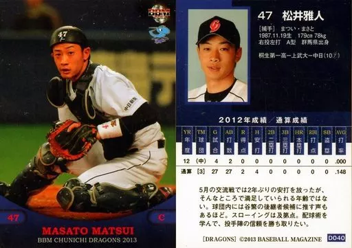 Nombre comercial en japonés: BBM/レギュラー/BBM2013 中日ドラゴンズ D040[レギュラー]:松井雅人