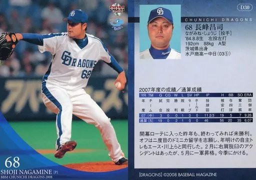 Nombre comercial en japonés: BBM/レギュラー/BBM2008 中日ドラゴンズ D30[レギュラー]:長峰昌司