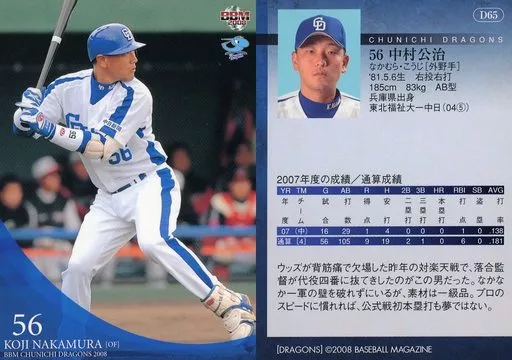 Nombre comercial en japonés: BBM/レギュラー/BBM2008 中日ドラゴンズ D65[レギュラー]:中村公治