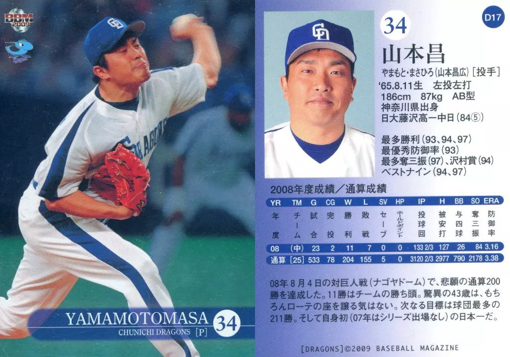 Nombre comercial en japonés: BBM/レギュラー/BBM2009 中日ドラゴンズ D17[レギュラー]:山本昌(キラパラレル版)