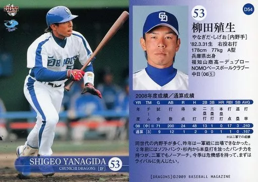Nombre comercial en japonés: BBM/レギュラー/BBM2009 中日ドラゴンズ D54[レギュラー]:柳田殖生
