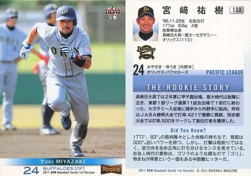 Nombre comercial en japonés: BBM/レギュラー/オリックス・バファローズ/BBM2011 ベースボールカード 1stバージョン 133[レギュラー]:宮崎祐樹