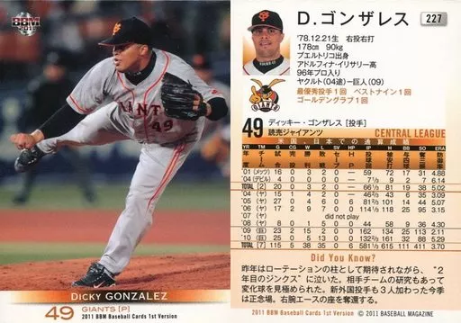 Nombre comercial en japonés: BBM/レギュラー/読売ジャイアンツ/BBM2011 ベースボールカード 1stバージョン 227[レギュラー]:ゴンザレス