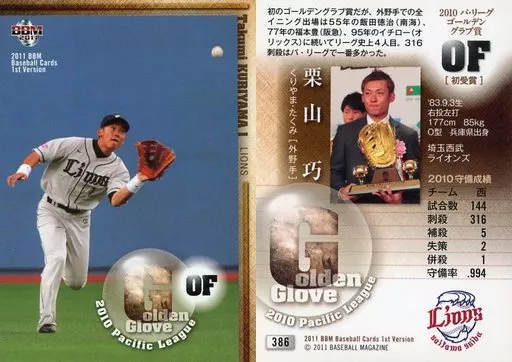 Nombre comercial en japonés: BBM/レギュラー/2010ゴールデングラブ/埼玉西武ライオンズ/BBM2011 ベースボールカード 1stバージョン 386[レギュラー]:栗山巧