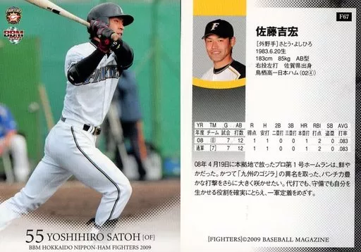 Nombre comercial en japonés: BBM/レギュラー/監督・選手・マスコットカード/BBM2009 北海道日本ハムファイターズ F67[レギュラー]:佐藤吉宏