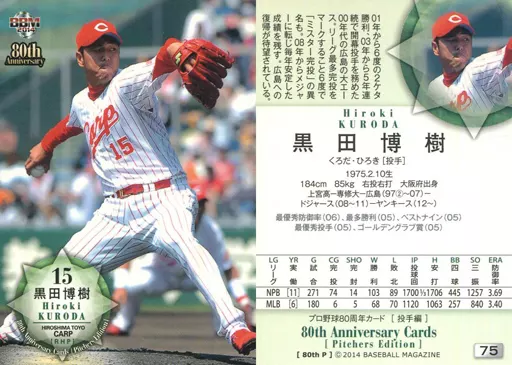 Nombre comercial en japonés: BBM/レギュラーカード/広島東洋カープ/BBM2014 プロ野球80周年カード・投手編 75 [レギュラーカード] : 黒田博樹
