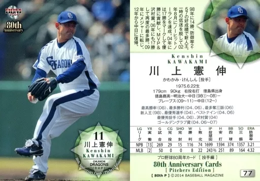 Nombre comercial en japonés: BBM/レギュラーカード/中日ドラゴンズ/BBM2014 プロ野球80周年カード・投手編 77 [レギュラーカード] : 川上憲伸