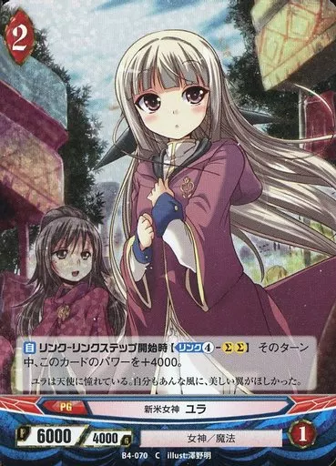 Nombre comercial en japonés: アンジュ・ヴィエルジュ/C/赤/PG/女神/魔法/ブースターパック第4章「蒼空の変転世界」 B4-070[C]:(パラレル)新米女神 ユラ