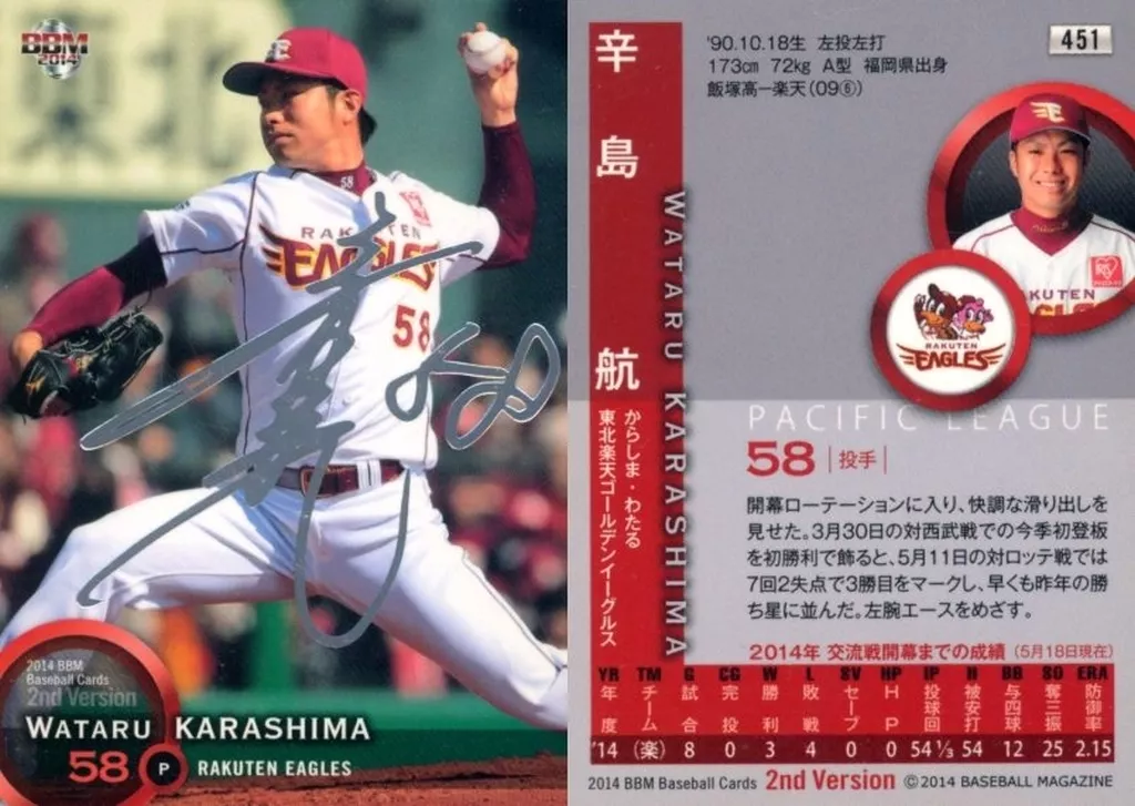 Nombre comercial en japonés: BBM/レギュラーカード/東北楽天ゴールデンイーグルス/BBM2014 ベースボールカード 2ndバージョン 451 [レギュラーカード] : 辛島航(銀箔サイン入り)